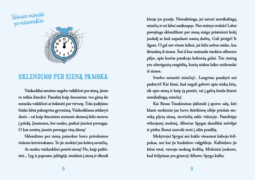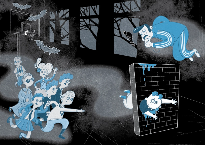 Intriguojantis detektyvas vaikams, kuriame susipina kasdieniška mokyklos aplinka ir šiurpiai smagus vaiduoklių pasaulis, teisybės siekį iškeliantis aukščiau už taisykles. Barškuvos miestelio pagrindinė mokykla tik atrodo kaip paprasta mokykla. Pamokos čia vyksta dviem pamainomis. Tuomet, kai bjauriai šviečia saulė, mokosi žmonės, o kai nurimsta vėjas ir pateka mėnulis – vaiduokliai. Smagiausia tai, kad nė vienas žmogus net neįtaria, kas vyksta mokykloje po vidurnakčio! Vaiduokliams bendrauti su žmonių vaikais draudžia mokyklos taisyklės. Bet kai per pamoką grupelė vaiduoklių aptinka tuščią kapą, o 66-oje spintelėje – žmogaus kaulą, niekam nekyla abejonių, kad atėjo laikas sulaužyti mokyklos taisykles ir užmegzti ryšį su žmonių pasauliu. Kas drįso apvogti numirėlį? Dabar visam miesteliui gresia didžiulė bėda! Smagi detektyvinė istorija, kurią parašė Danguolė Kandrotienė, Prano Mašioto premijos laureatė ir geriausios 2014 metų knygos vaikams autorė.
